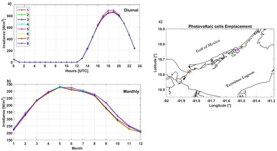 Variability of the solar irradiance: (a) hourly average irradiance, (b) monthly average, and (c) location of the emplacement sites. The colored crosses indicate the location of each emplacement point.