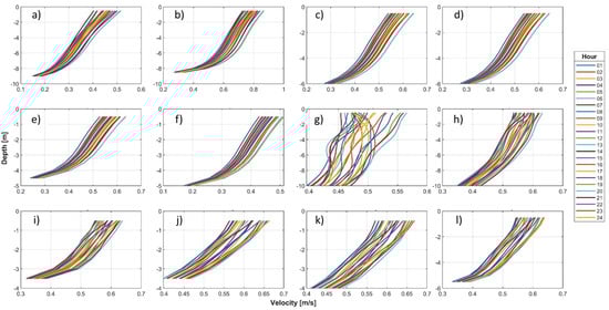 Hourly vertical profile currents average velocity with emplacement points (a–f) representing PtR and (g–l) representing CdC.