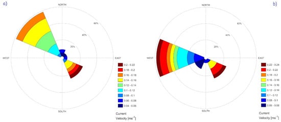 Figure 10 presents the current direction roses at both inlets, showing two predominant directions. Figure 10a shows that the northwest direction is the most frequent, accounting for more than 50% of the total current direction which coincides with the tidal flow. The other direction, to the southeast, occurs less frequently with a presence of 30% during the ebb tide but more intense. For PtR (Figure 10b), the predominant current direction is west, with a high occurrence rate of approximately 60%. Additionally, a secondary current direction with a lesser occurrence rate of 30% is observed in the southeast direction, corresponding to the flood flow; the highest speeds are observed in both directions. These results demonstrate the strong influence of the flood flow and ebb phenomenon on the current directions [21,24,26].