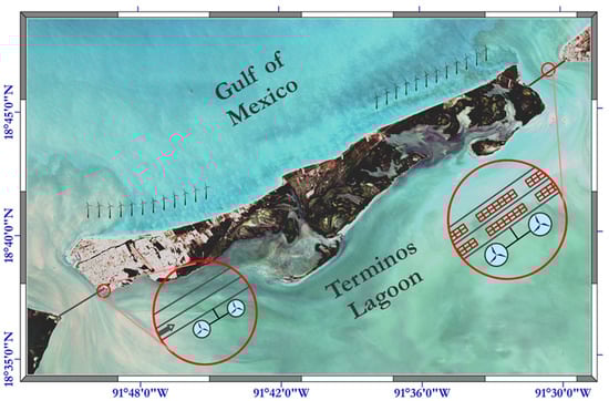 Due to its geographical location and territorial extension, Mexico has great potential in renewable energy resources [4,6]; however, it has not been sufficiently exploited. In particular, the Gulf of Mexico (GoM) coastal region is strongly influenced by trade winds and sea breezes [7,8], where several studies underscore the wind energy potential in the region [9,10]. Ref. [9] highlights the state of Campeche as a region with a significant wind potential, as it presents strong winds with an average of 7.47 ms−1, which during winter and spring have intensities just below those of Tamaulipas and the north and south of Veracruz; states with the largest wind resource in the GoM region. Studies by [6,11] indicate that Mexico has excellent solar potential throughout the year. Ref. [12] confirms that the state of Campeche has adequate irradiation for thermal and photovoltaic generation, exceeding 4 kWh m−2 day−1. While Mexico still lags behind several countries in installed solar capacity and growth, it has a significant advantage in solar radiation levels and a largely untapped market for solar energy development. Ref. [13] conducted a comparative analysis of the photovoltaic sector in Mexico and Germany, revealing that Mexico has significant potential to become a major player in the use of renewable energy. The authors noted that Mexico has substantial photovoltaic solar potential, and with appropriate policies and incentives, could position itself as an important producer of photovoltaic energy, akin to Germany, which has emerged among the top world leaders in photovoltaic technology generation and development. Refs. [9,14] indicate that Mexico’s wind and photovoltaic potential is favorable, and these energy sources complement each other for energy generation. Regarding tidal and ocean currents power, there are studies reporting the energy potential for areas in the Gulf of California and the Yucatan Current area, including the Cozumel Island Channel [15,16,17]. However, information on coastal lagoons is limited, despite the potential for narrow inlets to create high-speed currents suitable for power generation [18].