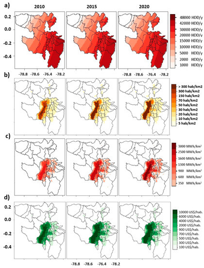 Figure 2 illustrates the expected results after applying this methodology in Quito, the capital city of Ecuador. Here, four consumption drivers in Quito’s residential sector are illustrated. Figure 2a shows the heating degree days for 2010, 2015, and 2020. Variations in the degree of heating demand can be observed as a function of outdoor temperature across Pichincha Province. In Figure 2b, we can see the population density distribution. As expected, the population is concentrated in Quito, which has the highest population density. Figure 2c shows the results of combining outdoor temperature data with population and energy consumption by applying the methodology presented in this article. Finally, Figure 2d shows the GDPpc distribution across the Pichincha Province. The methodology presented herein allows researchers to estimate the residential consumption drivers for enhanced energy planning and policy strategies.