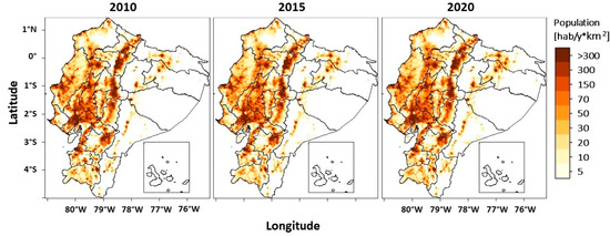 Annual geospatial population density of Ecuador in 2010, 2015, and 2020.