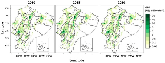 Annual geospatial GDP of Ecuador in 2010, 2015, and 2020.