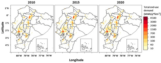 Annual geospatial total end-use energy demand of Ecuador’s residential sector from 2010 to 2020. These include space heating, cooling, and water heating.