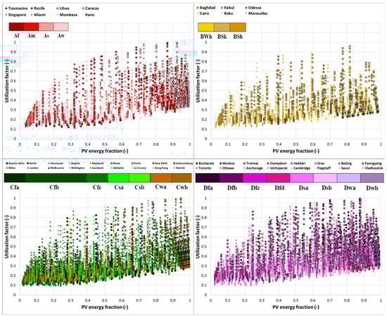Utilization factor of 343 system power configurations across Köppen–Geiger climates.