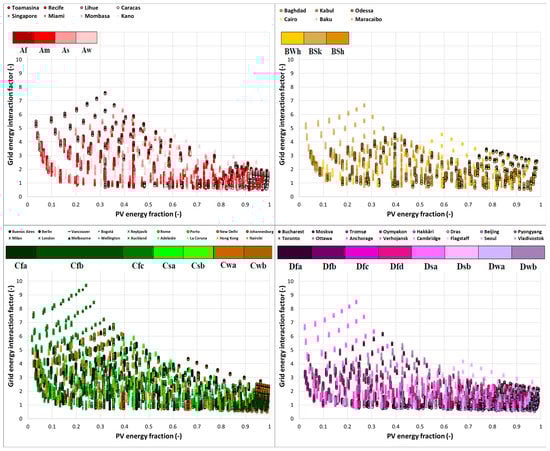 Grid energy interaction factor of 343 system power configurations across Köppen–Geiger climates.