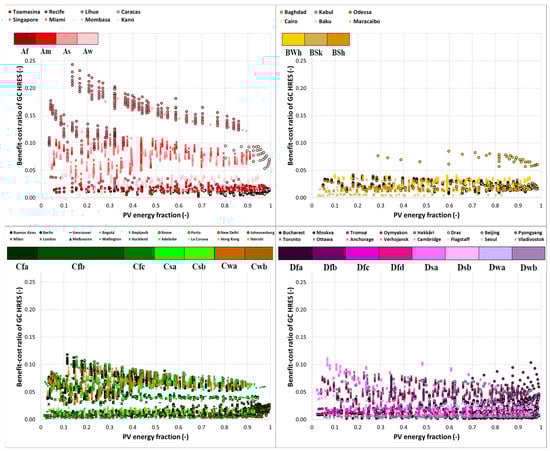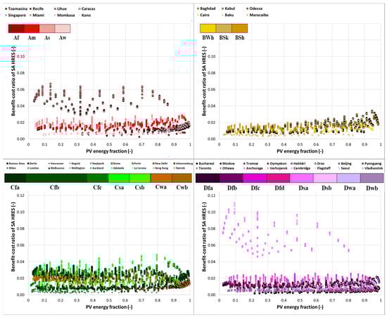 Figure 6 and Figure 7 illustrate the values obtained from the benefit-cost ratio (BCR) for SA and GC HRES, respectively, as a function of the PV energy fraction, represented by Köppen climate groups and sub-groups.