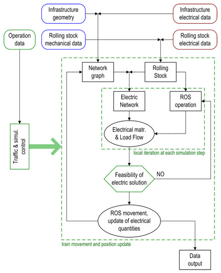 The used electromechanical simulator integrates two main modules, namely the electric traction network (ETN) and the rolling stock (ROS), controlled by an overarching traffic module (shown in green in Figure 1) sharing an approach that is common to other electromechanical simulators. The overall simulation process is depicted in the flowchart of Figure 1.