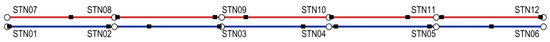 All simulation tests were performed considering a double-track 750 V DC urban light rail system shown in Figure 2. Each line, with two opposite running directions, has a total length of 11 km, but the analysis is focused on a central line section of 4.5 km, serving 12 passenger stations (six stations in each direction).