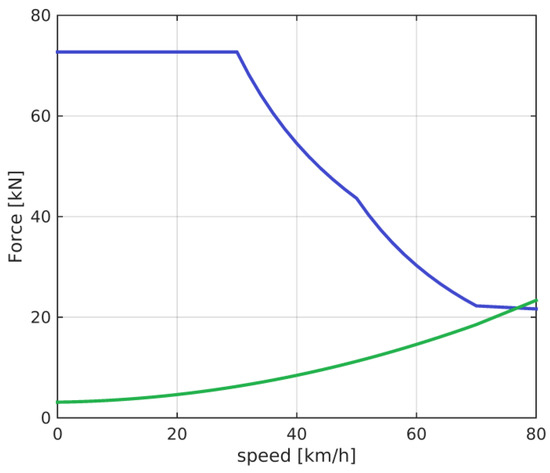 Traction effort (blue) and motion resistance (green) curves of the simulated vehicles on a flat track.