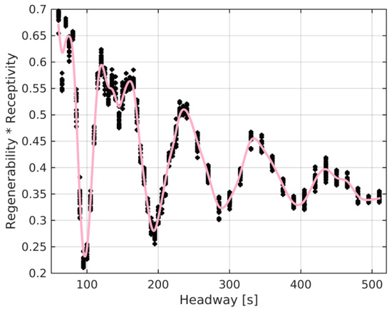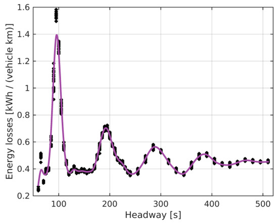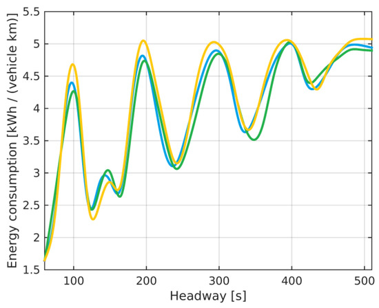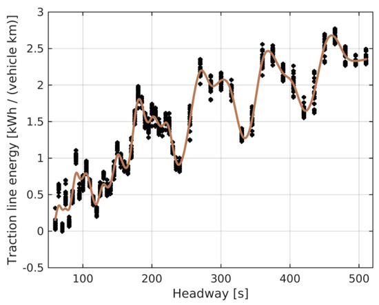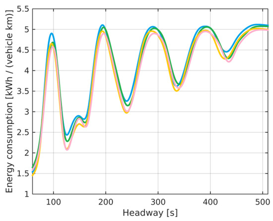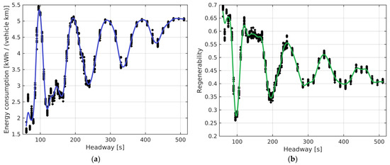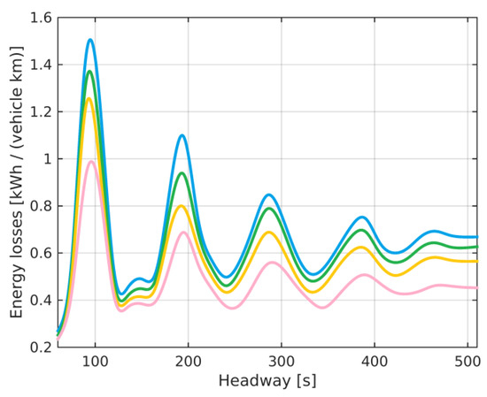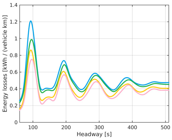 Considering (1) and (6), the time interval for calculation should be chosen to assure data consistency and to allow the comparison of results from different scenarios in terms of headway, the mean speed of running trains, and other operating parameters. With “data consistency”, it is not only intended that a sufficiently large set of data points are collected from simulations, but also that train operating conditions and distribution patterns along the line are repeated a sufficient number of times to avoid singular cases. In this work, for the results in Section 4, the time window is chosen to have an approximately constant number of simultaneously running trains: an early “warm-up” pre-simulation is performed before each test to fill the traction line with the correct number of running trains and reach the desired nominal configuration.
