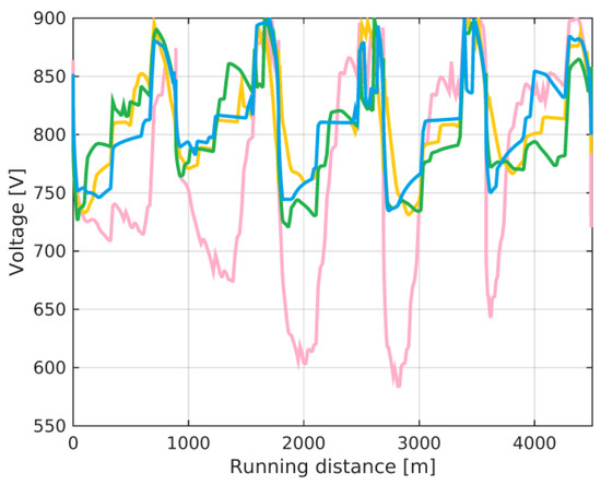 The system is fed by four TPSs (2.6 MVA each), ensuring a power density of approximately 0.9 MVA/km (and approximately 0.7 MVA/km, in case of one TPS failure); the power is delivered to the vehicles through a 300 mm2 overhead catenary distribution system. The allowed voltage levels along the line are set as prescribed by the EN 50163 [25] (i.e., between 500 V and 900 V, for a 750 V DC line). The main characteristics of the simulated traction line are reported in Table 2.