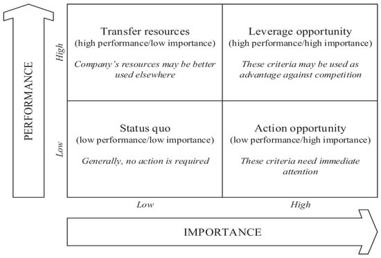 In the leverage opportunity quadrant, both the performance and the importance are high. As the name of this quadrant suggests, the criteria that are located here should be leveraged as advantages against competition and the high performance of these criteria should be maintained. The action opportunity quadrant presents high importance/low performance. These criteria call for immediate attention and actions must focus on these criteria in order to improve the performance of the organization. Finally, in the transfer resources quadrant, performance is high, but importance is low, meaning that the organization utilizes resources to achieve high importance in criteria that, however, are not significant. For this reason, resources allocated for criteria in this quadrant should be transferred to the criteria in the action opportunity quadrant whose satisfaction dimensions need to be improved.