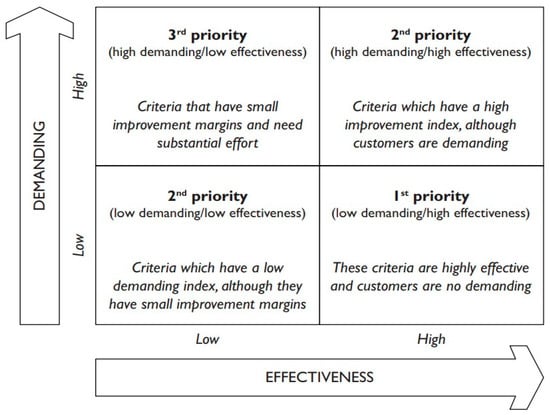 Action diagrams can show the satisfaction dimensions that must be improved (Figure 1). However, they cannot indicate the level or extent of improvement efforts [21]. The latter task is achieved by the improvement diagrams, which are developed by combining the average effectiveness and demanding indices. Therefore, improvement diagrams can be used to rank improvement priorities [56].