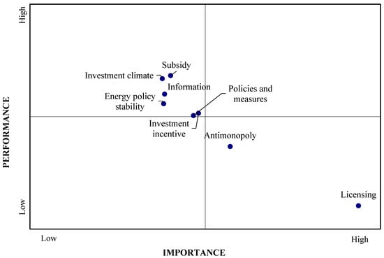 - Subsidies for investments in RES, the stability of energy policy, the provided information on investments in renewable energy, and the investment climate are clearly located in the transfer resources quadrant, which is characterized by high performance and low importance. This result shows that the state pays attention to criteria that, in comparison to other criteria, are less important for citizens’ satisfaction. Resources that the state allocates to these criteria may be transferred to more important criteria that have low satisfaction indices; that is, resources should be transferred and used for the improvement of criteria that concern the licensing process along with the measures for mitigating the monopoly of fossil fuels. It should also be noted that there are two more criteria but are located too close to the intersection of axes and fall marginally into this quadrant; these criteria involve investment incentives along with policies and measures for improving the competitiveness of renewables in the energy market.