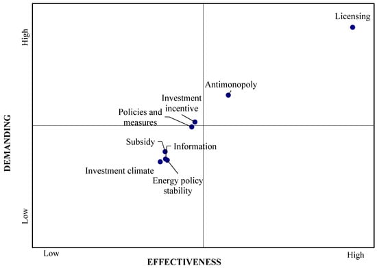 - The measures for mitigating the monopoly of fossil fuels (such as the reduction of subsidies for fossil fuels) along with the licensing process appear in the second-priority quadrant (high demanding/high effectiveness). This location indicates that citizens are highly demanding in terms of these two criteria;thus, the state needs to exert significant effort in order to increase satisfaction with these criteria.