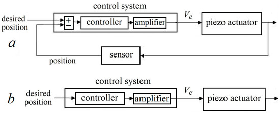 Figure 1a depicts a conventional feedback position control system for a piezoelectric actuator, including a position sensor and a voltage amplifier. Ve stands for the excitation voltage, the input voltage to the piezoelectric actuator. A precise position sensor (e.g., among the ones listed in [15]) imposes considerable cost and more importantly serious limits in terms of space and calibration on the micro/nanopositioning system. Consequently, sensorless approaches have attracted a lot of attention [22,27,28]. The simplest control architecture for sensorless control is feedforward, as depicted in Figure 1b (similar to [29]); however, this architecture sacrifices accuracy, having no signal representing the actuator’s position.