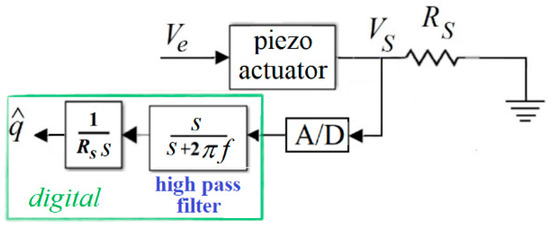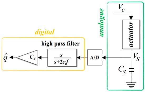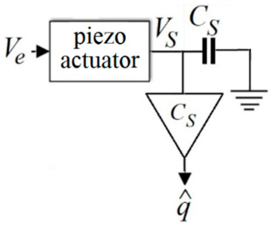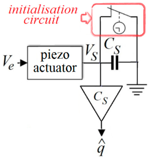 Figure 5 is a simplified schematic of a charge estimator inspired by the pioneering work in [43], published in 1981, where the sensing element is the capacitor of CS. As VS is not applied on the actuator, it is also known as the voltage drop.
