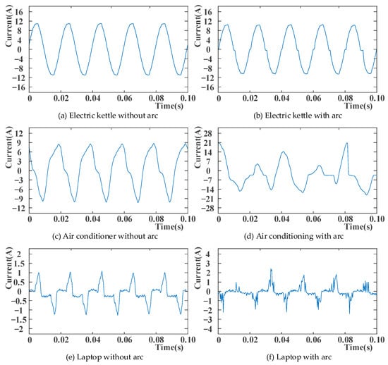 In the household, there are a variety of electric appliances that can usually be divided into the following types: resistive appliances, inductive appliances and appliances with the switching power supply. In this paper, we selected three corresponding typical appliances for our research: an electric kettle, an air conditioner and a laptop, respectively. Their rated parameters are shown in Table 1. According to the above arc fault data acquisition schematic, we carried out experiments and recorded the current and voltage data of each appliance under its normal and arc fault operations. The data sampling frequency was 25 kHz. Figure 2 shows the normal current waveforms and arc fault current waveforms of the three appliances. It should be noted that the voltage data were measured at the power supply for all appliances under different conditions, that is, 220 V/50 Hz, so the voltage waveform is not displayed in detail.