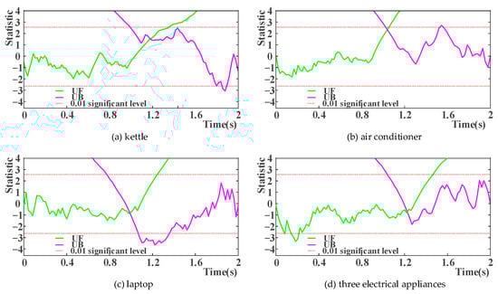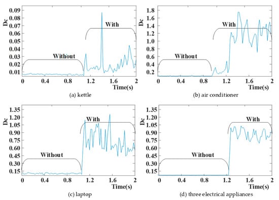 Figure 3 shows the value of Dc in some scenarios. (a)–(c) represent the Dc value without and with the arc when only one single electric appliance is operating. (d) shows the Dc value of the aggregated current with an arc on the common branch under the operation of multiple appliances. It can be seen that the Dc values of different appliances are relatively stable at a small value under normal operation. However, when a series arc fault occurs, the magnitudes are much larger with large fluctuations. When an arc occurs, the value of Dc suddenly increases, so the Mann–Kendall test can be carried out for Dc, so as to obtain the timestamp of when the current changes suddenly.