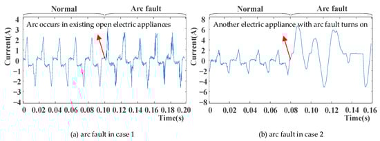 As shown in Figure 5, the sudden changes in the aggregated current can be divided into two cases: case 1 is where the electric appliance operates under normal conditions at the beginning and a sudden arc fault occurs, resulting in distortion of the current waveform; case 2 is where a certain electric appliance turns on or off, and the current suddenly increases or decreases. The event detection examples shown above belong to case 1. For case 2, when a normal electric appliance is turned on or off, the value of Dc will not have a large change, so no arc event will be detected, which will not affect the arc detection. If the branch where the switched electric appliance is located has a potential arc hazard, the Dc value will suddenly increase. The event detection results in this case are similar to those in case 1 mentioned above, so we do not show them in this paper.