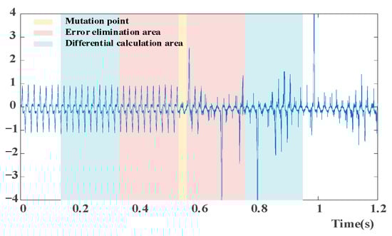 Considering that the Mann–Kendall Test-based event detection method introduced in the previous section inevitably has some errors, we select 20 cycles before and after the mutation point, respectively, as shown in Figure 6. We divide these 40 cycles into an error elimination area and a differential calculation area, and each area includes 20 cycles. The differential current is obtained by subtracting the cycles in the differential calculation area before and after the mutation point. The differential current consists of ten current cycles.