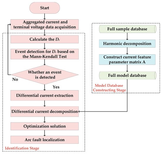 As shown in Figure 7, the non-intrusive arc fault detection and localization method proposed in this paper, based on the Mann–Kendall Test and current decomposition, includes two stages: the model database construction stage and the identification stage.