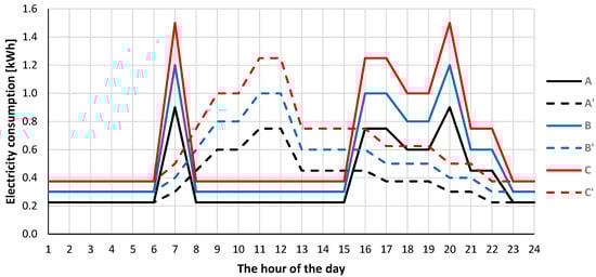 On Monday through Friday, it was assumed that the highest energy consumption by residents occurs between 6–7 a.m. and 3–8 p.m. The profiles take into account the fact that between 7 a.m. and 3 p.m. residents are out of the household (at work, school). On the other hand, on weekends, i.e., Saturdays and Sundays, the electricity consumption profiles (A’, B’, C’) consider the fact that the highest activity of residents is during the day around 12 p.m.