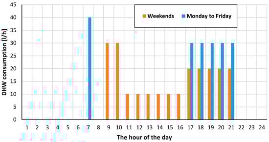 The main influence on ASHP activity was DHW consumption. Figure 2 shows the DWH consumption profiles set in the Type 14b component for Monday through Friday and for weekends. The total DHW demand was 220 L/day on weekends and 190 L/day on normal weekdays.