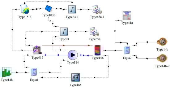The transient installation model was created in Simulation Studio in TRNSYS. TRNSYS is a graphical software environment for simulating the behaviour of transient systems, particularly involving RES devices. Thanks to the flexibility of the software and the many available components known as black boxes called “Types”, TRNSYS allows for efficient and accurate modelling of complex systems and conducting parallel analyses. A further strong advantage of TRNSYS is that during a simulation, TRNSYS executes the procedures of each component in a sequential manner, but it also employs advanced algorithms to ensure that the simulation converges to a steady state solution within a reasonable amount of time. This means that the component procedures are called and executed simultaneously, but the simulation as a whole progresses in a sequential manner, following a defined time step [].