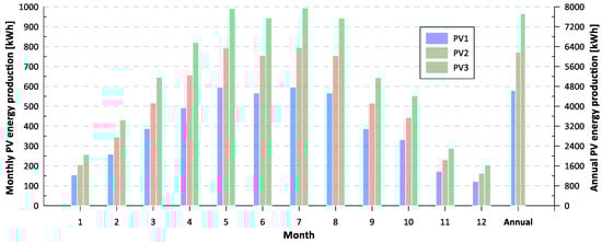Figure 4 shows the monthly and annual changes in electricity production for the various PV systems analysed. The largest amounts of energy were produced in the months of May–August, while the smallest amounts were produced in December and January, which is typical of Poland’s climatic conditions. The largest monthly amounts of energy reaching up to 130 kWh per 1 kWp of PV panel capacity were generated in the considered PV installations in May and July. In these months, daily energy production reached 4.2 kWh per 1 kWp of PV installation capacity. Annually, the individual systems produced 4634 kWh for PV1, 6178 kWh for PV2 and 7723 kWh for PV3. This provided a value of 1016.3 kWh per 1 kWp of PV installation capacity or 203.7 kWh per square meter of PV panel area. These results are similar to those presented in the paper [].