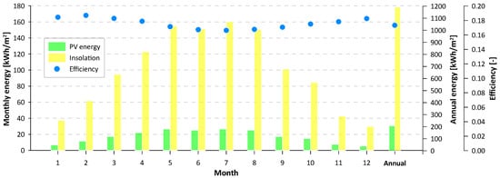 Figure 5 shows the monthly and annual electricity production per unit surface of the PV panels. Additionally, on this graph can be seen the values of monthly and annual insolation (for a 35° slope of the surface and south facing) and PV installation efficiency. The highest values of monthly electricity production of 26 kWh/m2/month were achieved in summer with insolation reaching 155 kWh/m2/month. Annually, from 1 m2 of PV surface in the considered installations, 206.6 kWh of electricity was achieved from the available 1191.3 kWh (annual insolation). Due to the increase in ambient temperature, the efficiency of PV panels in the summer period was almost 2% lower compared to the winter period, where it is was high as 18.45% in January. The annual average energy efficiency of the PV systems considered in the simulations was equal to 17.34%. The values presented above were calculated assuming that the efficiency of the inverter converting DC to AC was equal to 95%.