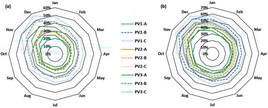 Monthly SC values depending on the PV installation power and energy consumption profile for simulations with and without ASHP in the considered installation are presented as radar charts in Figure 6.