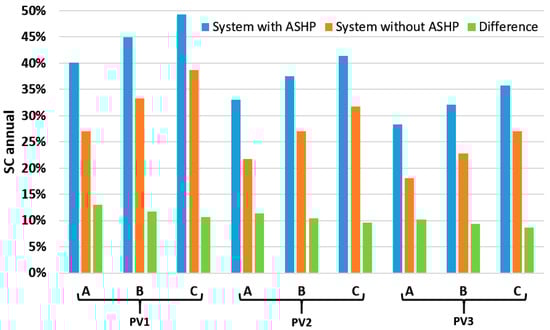 Figure 7 shows a comparison of annual SC values depending on PV installation capacity and energy consumption profile. The highest SC values of up to 49% were obtained for the PV1 installation and energy consumption profile C in the installation with ASHP, and the lowest of 18.12% were obtained for the PV3 installation and profile A. The presence of ASHP in the installation caused an increase in annual SC values in the considered installations by up to 13%.