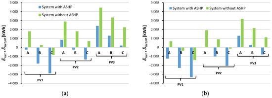 Very interesting results of the simulation of the operation of the considered installations are shown in Figure 8. Depending on the adopted value of φ, a different balancing of the amount of energy produced by the PV panels was obtained. When φ = 1 (i.e., for a situation in which in a 1:1 ratio the same amount of energy is obtained from the grid as was previously injected into it from the PV installation) and the installation had an ASHP (the blue colour of the bars in Figure 8), then in the case of PV1 and profile A, PV2 and profile B and PV3 and profile C, the energy fluxes Egen and overall energy consumed in the building relatively balanced each other (i.e., the value of Enet,HP is close to 0). On the other hand, when φ = 0.8 (i.e., 80% of the PV energy injected into the grid can be taken back from the grid), only in the case of PV2 and profile A there is a balancing of energy fluxes.
