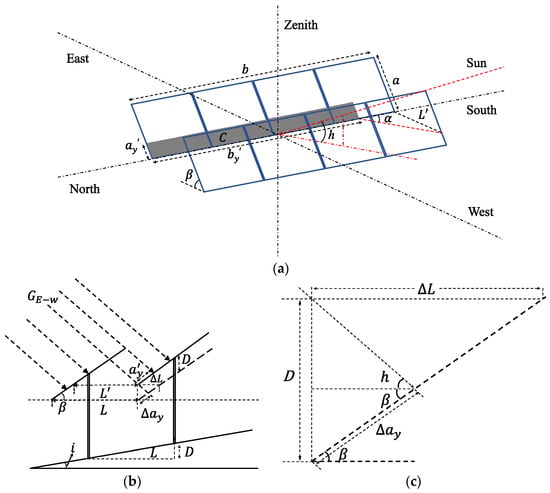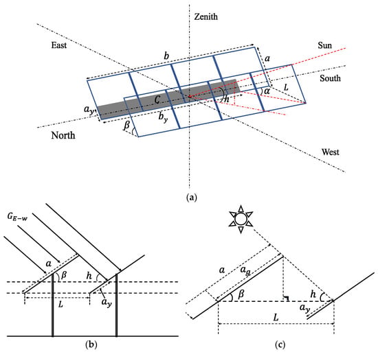 Given a uniaxial PV array placed on the horizontal plane, the generated shading between front and rear PV strings can be shown as in Figure 1. Suppose the longitudinal length of PV string is b, the width is a, the length of the shaded part of the PV panel is by, the width is ay and the shaded area is C. The horizontal spacing of the PV array is L, the inclination angle of the PV panel is β (positive facing west, negative facing east), the solar altitude angle is h, and the solar azimuth angle is α (with due south as 0°, positive westward and negative eastward). As demonstrated in the figure, the shading of the PV array would be affected by the position of the sun, as well as the array dimensions. The geometric relationship between the width of the shaded area and the width of the PV string, spacing and solar altitude angle can be presented as in Figure 1b,c. Thus, the shaded width ay can be determined via Equation (9).
