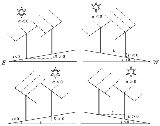 As shown in Figure 2, the tilt angle of a PV array varies with the solar azimuth, which might reverse the front and rear arrays, resulting in a change in the sign of the elevation difference D. With the sign of the constant sloping angle i as a baseline, when the solar azimuth angle α < 0, the PV panel would face east, and the sign of D is opposite to that of i, while for α > 0, the PV panel faces west, and D has the same sign as i. By integrating the geometric relationship, the formula for D value can be obtained as: