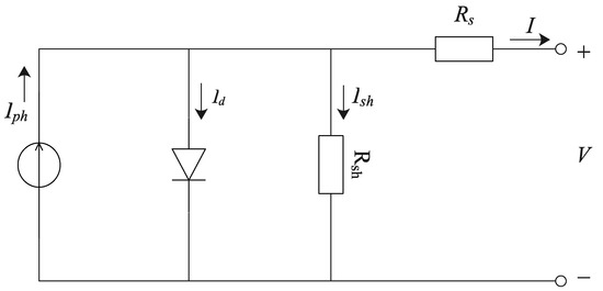 Figure 4 shows the equivalent circuit of a PV cell, which consists of an equivalent current source, a diode and a shunt resistance Rsh connected in parallel, and then connected in series with a resistance Rs. In this circuit, the photocurrent Iph from the current source flows out in three directions, the forward current Id of the diode, the shunt resistance current Ish, and the output current I flows through the series resistance Rs to the load [23].