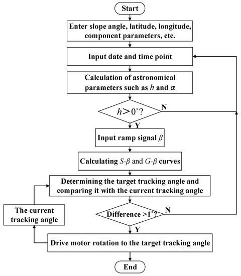 Based on the astronomical calculation formula and the mathematical model developed in this study, a Matlab/Simulink model was created to calculate the solar irradiance, dynamic shadow area and PV module output power. Input and output parameters are set and encapsulated as shown in Appendix A, Figure A1 and Figure A2. The slope signal β varies within the range [−45°, +45°], which is consistent with the tracking angle range. By inputting parameters such as date, time and slope angle i, the dynamic S-β and G-β curves can be obtained, which change over time and are used to determine the tracking angle of the slope terrain single-axis array. When the calculated target tracking angle differs from the current tracking angle by more than 1°, the motor is activated for tilt correction. The process of calculating and adjusting the tracking angle of the single-axis tracker using this tracking strategy is shown in Figure 5, where the date and time point are dynamic.