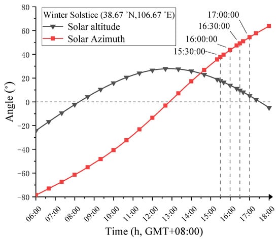 As the solar farm is located in the Northern Hemisphere, the solar altitude angle on the winter solstice (22 December) is the lowest of the year. At this time, there might be shading and obstruction between the horizontal single-axis arrays. Therefore, the winter solstice is selected in this study as a typical day for simulations. The solar altitude and azimuth angles for each moment are shown in Figure 6. The corresponding parameters from Table 1 and Table 2 are involved as the inputs of the Simulink model, with the slope angle set as the typical slope of the solar farm (−7°). There are four typical moments on the winter solstice, including 15:30, 16:00, 16:30 and 17:00, selected for analysis.