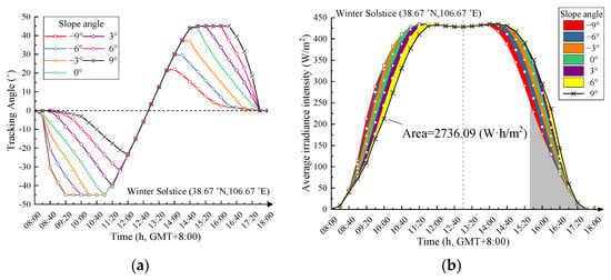 Comparison of tracking angles and average irradiance intensity over slope terrains, (a) Tracking angles, (b) Average irradiance intensity.