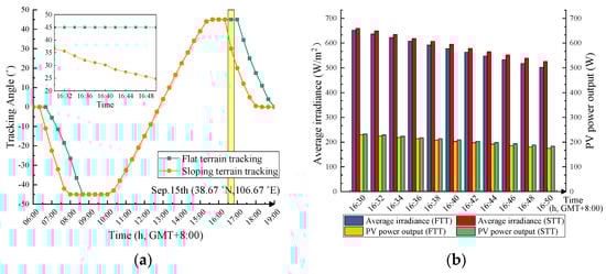 Simulink simulation was performed with a step size of 2 min, and the uniaxial tracking angle data for both tracking strategies during the power generation period of 6:00–19:00 were obtained and are shown in Figure 10a. In order to investigate the differences in PV power output between the two tracking strategies and their causes, the differences in tracking angles between 16:30 and 16:50 were selected for analysis. According to Equation (19), the average irradiance collected by the uniaxial PV array at −7° slope with different tracking angles was calculated, and finally, the PV panel yield was assessed with the proposed PV model; the results are shown in Figure 10b.