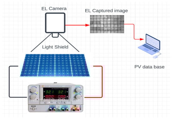 If an EL inspection is requested after deployment, IR monitoring should be performed first in order to locate any PV modules that have anomalies so that they could be taken out of the PV string before being sent for EL inspection. In addition to this, due to technical improvements such as the widespread use of drones, on-site EL inspection is now possible without disconnecting localized modules. However, a near-dark condition and particular equipment, such as an EL camera, are necessary beforehand [36]. Figure 4 presents the standard process for EL-based PV cell surface image procurement. A current is fed into the terminals of the solar cell via an external power supply. This enlightens the cell surface; however, this is not visible to the human eye [36]. Hence, an EL camera is used for capturing the illuminated cell surface image [37]. When inspecting an EL image, the illuminated surface corresponds to the active area of the cell surface, with darker regions representing busbar connections in a periodic manner. Any other darker regions appearing sporadically imply defective regions [38,39].