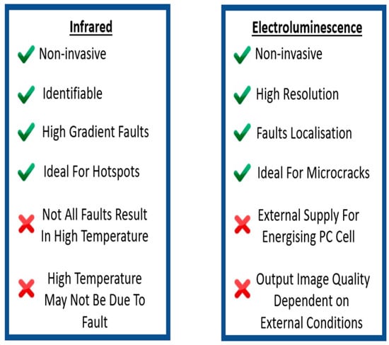 Each of the aforementioned mechanisms has some advantages and disadvantages. Hence, the extent of the application and the testing goals should be taken into consideration while choosing the inspection mechanism. IR-based methods are suitable for applications that need precise measurements of the current, while bulk defect imaging applications benefit from EL, particularly micro-cracks, series resistance image data, and breakdown junction imaging [45]. The Chart below (Figure 5) gives a summary of the benefits and drawbacks of both measuring methodologies.