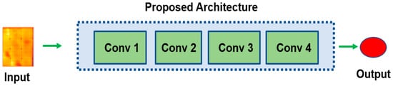 Artificial intelligence has been the subject of research, particularly computer vision, to eliminate the drawbacks associated with human inspection and boost solar cell production output efficiency. Convolutional neural network (CNN) architecture is suggested by M. Waqar Akram et al. [66] for the detection of faulty PV cells, as shown in Figure 6. The researchers present their findings of an ‘isolated-model’ (98.57%) that was tuned for EL-based images via transfer learning, which resulted in a 99.23% accuracy rate. The authors claim that because there are only about 800 images in the dataset, a deep architecture would lead to overfitting. There are two major phases of the research. The initial stage centers on creating a CNN using EL images. The EL-trained CNN is utilized as a pre-trained model in the second phase and is adjusted based on infrared images (IR) of faulty cells. The accuracy of the pre-trained model (EL-based) was 98.67%. Although the reported accuracy is outstanding, a closer examination of the approach, particularly the data collecting and pre-processing, reveals that faults were artificially added to the cell pictures rather than true defects. The authors select data augmentation in order to increase the size and variation of the dataset. Naturally, this results in a 6.5% improvement in the model’s accuracy. The four-block CNN network with a fully linked layer feeding into a SoftMax function was chosen by the authors, after considering the CNN architecture in detail. The choice to utilize the Adaptive Moment Estimation (ADAM) optimizer is not supported by a comparison to other optimizers such as the Stochastic Gradient Descent (SGD), but rather by the fact that it is well-recognized and widely used.