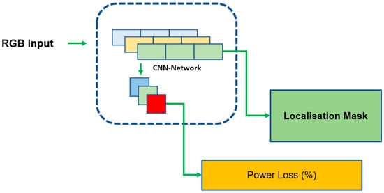 A CNN is suggested by Sachin Mehta et al. [67] for the detection of PV soiling and other faults. The authors concentrate on both the location of flaws on the PV cell as well as their detection. Traditionally, the process of classifying and localizing images is referred to as object detection. Bounding boxes are created for the locations of the points of interest as a conventional strategy to solving object-detection problems, and these boxes are subsequently used for supervised model training. The authors suggest, however, replacing bounding boxes for each image with power loss, as shown in Figure 7. Although this can be considered a novel contribution, the dataset utilized is of a considerable size containing more than 45,000 images to train the network, bringing into question the generalizability of the proposed methodology on smaller datasets. Furthermore, the hardware specifications listed by the authors, such as the use of an NVIDIA TitanX GPU, which is not commonly available for PCs, might be used to estimate the computing load of the network. However, the model can only run at 22 frames per second (FPS).