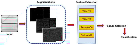 A two-stage procedure is suggested by Mustafa Yusuf et al. [81] for the detection of various EL-based solar cell faults. First, the dataset is scaled using a variety of data-augmentation approaches, paying special attention to the defective classes. The authors train four well-known models, DarkNet-19, ResNet-50, VGG-16, and VGG-19, using transfer learning to extract features from the enhanced dataset, as shown in Figure 9. Following the selection of the most distinctive features, classification is carried out using several machine learning architectures, such as support vector machines and random forest. We also investigated this strategy while focusing on the first stage of the study, or transfer learning, but we believed that the pre-trained network designs were quite deep and consequently highly computationally intensive. We also demonstrate how feature extraction is directly possible with just one carefully constructed CNN architecture. With an overall F1-score of 98.0%, we employ our suggested architecture for feature extraction as well as classification.