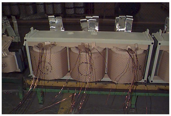 The design of the proposed shell-type three-phase distribution transformer has the following initial parameters: rated power 750 kVA, primary voltage 13,200 YT/7620 V with copper winding, secondary voltage 440 Y/254 V with an aluminum coil, and a core made of electrical M-3 steel. Figure 1 shows the active part of the transformer, consisting of a wound core and corresponding windings.