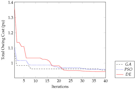 Table 5 represents the TOC of the active part of the transformer, obtained by each compared algorithm as well as the corresponding statistical values. It can be seen that the DE obtained better TOC, with respect to the GA and PSO. Such statistical differences are significant as indicated by the “+” sign in the Wilcoxon rank sum test [46,47]. It is worth mentioning that the GA obtained more robust results (i.e., lower standard deviation values with a better worst result), but the median and mean values are not as good as those found by DE.