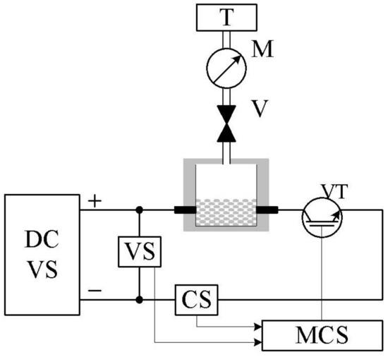 Installation diagram. DC VS—direct current voltage source; VS—voltage sensor; CS—current sensor; T—trap; M—manometer; V—valve; VT—insulated-gate bipolar transistor; MCS—microprocessor control system.